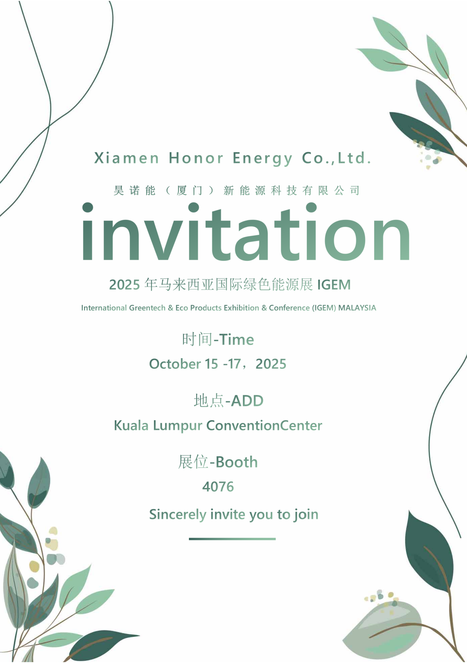 நாங்கள்மகிழ்ச்சி அடைந்துள்ளனர்2025 மலேசியா சர்வதேச பசுமை ஆற்றல் கண்காட்சிக்கு (IGEM) எங்களது அதிகாரப்பூர்வ அழைப்பை உங்களுக்கு அறிவிக்கிறோம்.